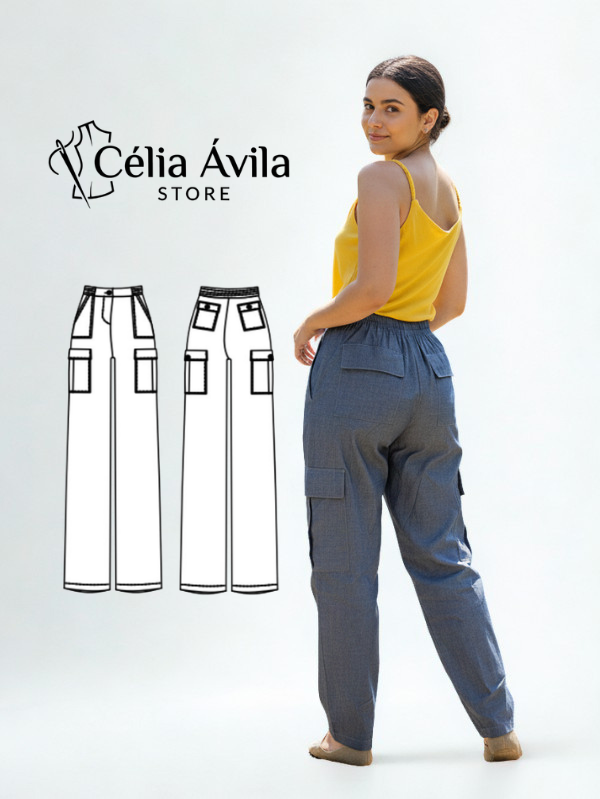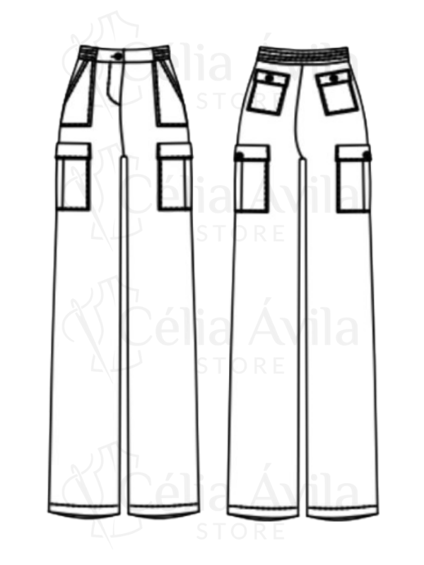 Bolsos (Design Cargo): A modelagem apresenta bolso faca aplicado na frente , bolso lateral com prega e lapela , e bolso nas costas também com lapela. É fundamental observar as informações impressas no molde sobre a posição exata de aplicação do bolso traseiro.