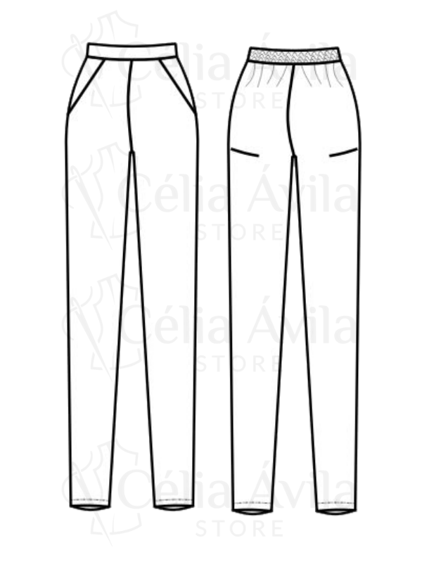 Costas e Elástico: A parte traseira possui cós projetado para a aplicação de elástico. Para o corte exato, o elástico deverá medir a metade da circunferência da cintura (conforme a tabela de medidas do tamanho escolhido) subtraindo 10%.