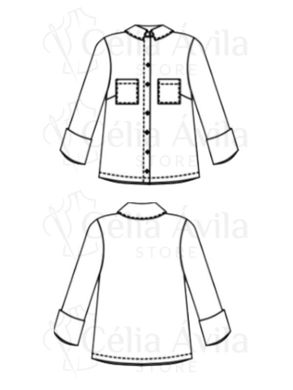 5 botões de 2 cm. Atenção: A ficha técnica lista botões de 2 cm nos aviamentos, mas o desenho técnico aponta botões de 1 cm no corpo da camisa. Recomendo verificar qual tamanho é o ideal para o seu projeto final.