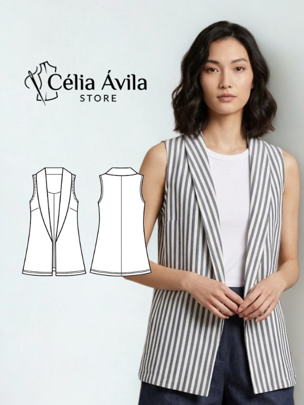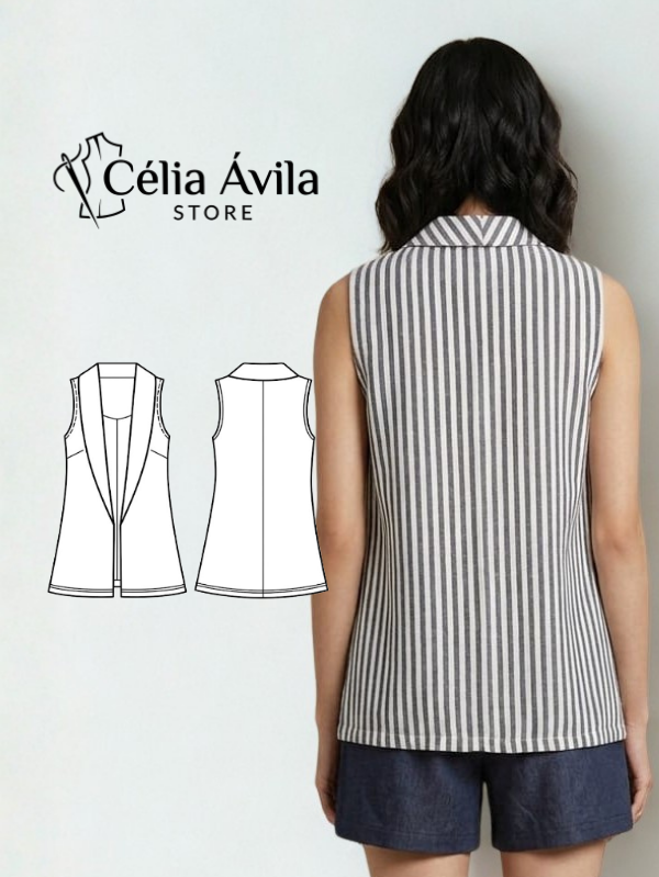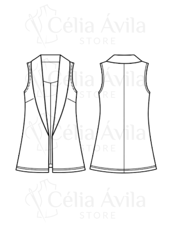 Frente e Gola: A peça possui pence e gola inteira. Para estruturação correta, é necessário aplicar entretela no revel.