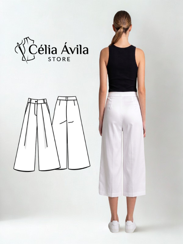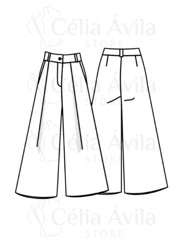Fechamento e Detalhes: A peça apresenta bolso faca e acabamento com pregas na parte frontal. O fechamento na cintura exige a aplicação de um zíper e de 1 botão.