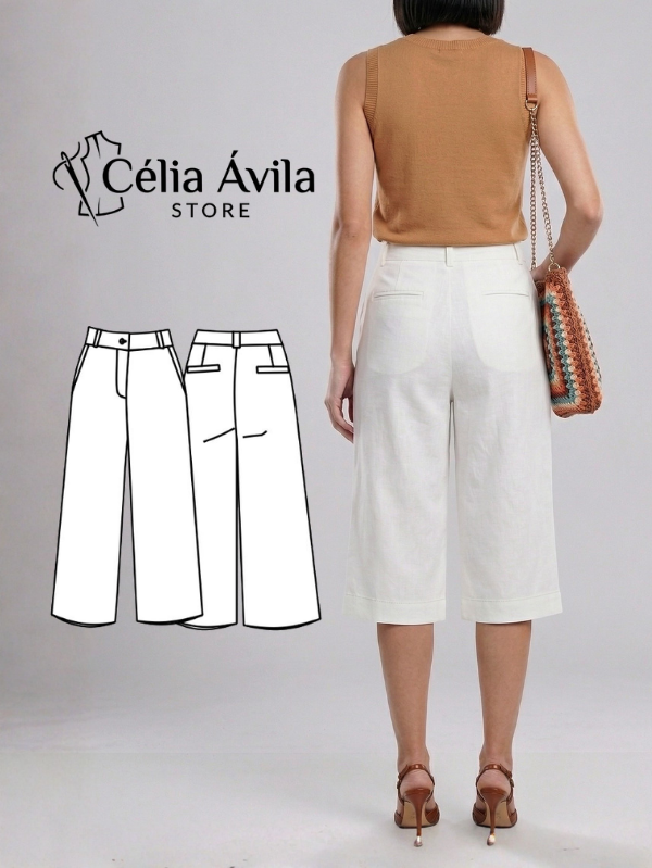 Molde digital da Pantacourt Estilo Alfaiataria, uma peça clássica e atemporal que une o conforto da pantalona curta à sofisticação do corte de alfaiataria. Modelagem profissional pronta para imprimir e costurar.