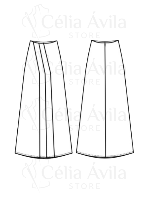 Molde digital da Saia Mirtes. Modelagem profissional com recortes direcionados e costas evasê, pronta para imprimir e costurar.
