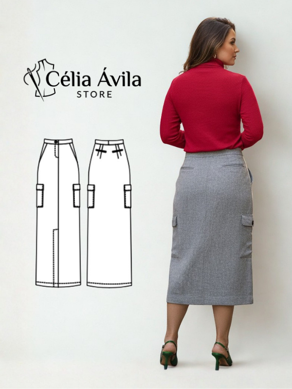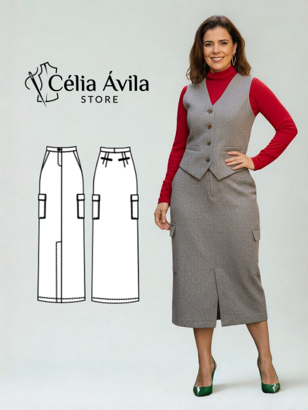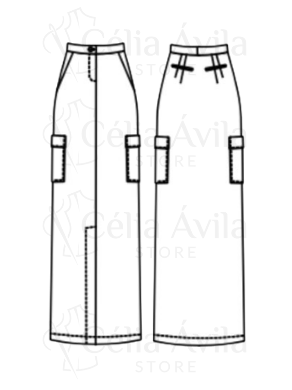 Saia: Apresenta fenda. É essencial observar as informações de corte indicadas diretamente no molde para a montagem correta.